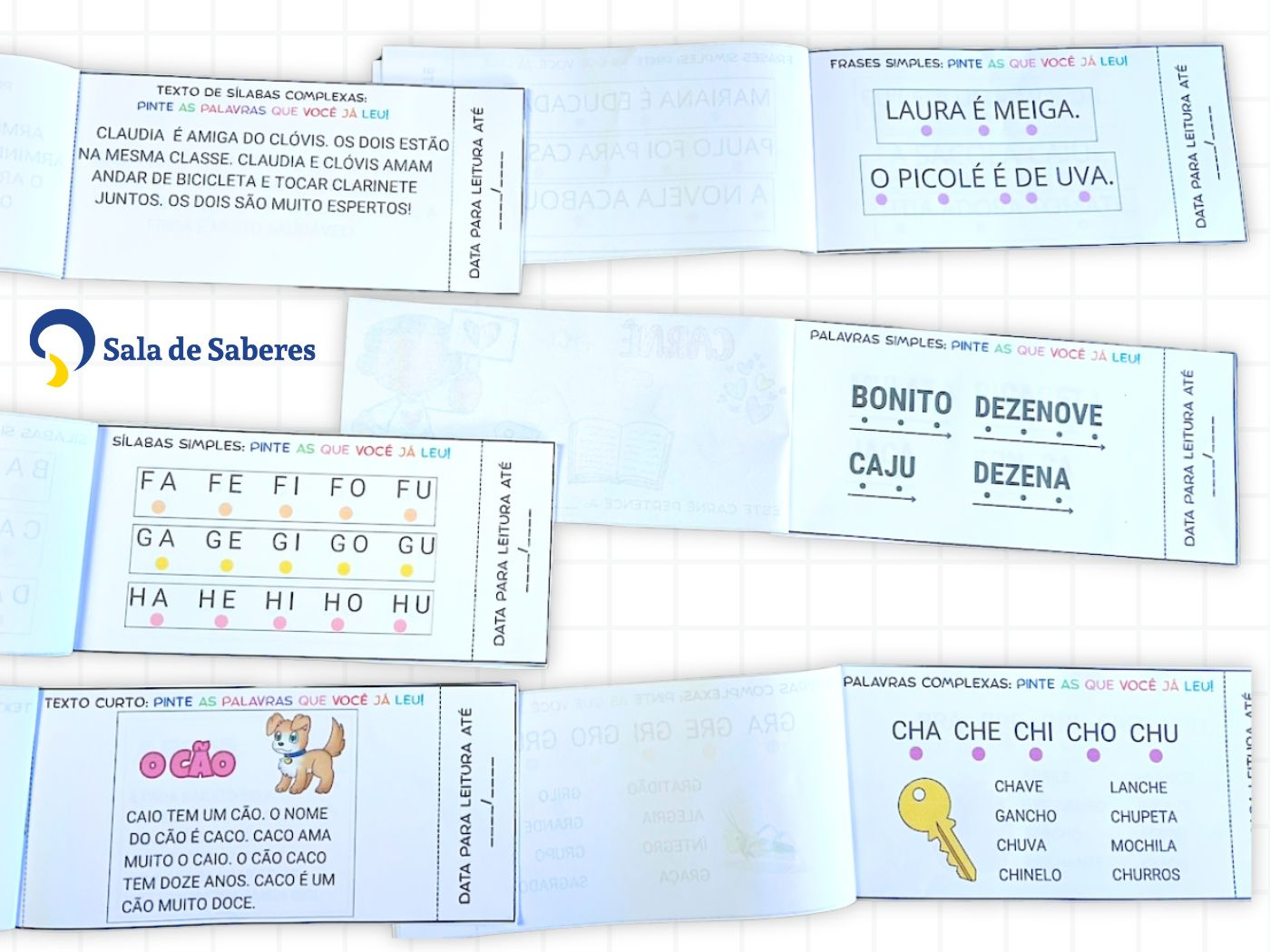 Material didático completo e progressivo para acompanhar e registrar a evolução da leitura de crianças em processo de alfabetização, contemplando vogais, alfabeto, sílabas, palavras, frases e textos.