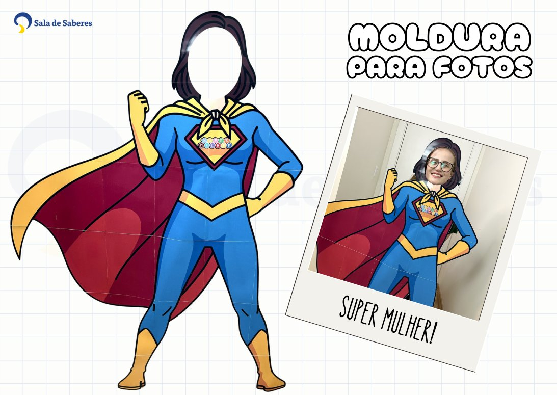 Diversão garantida com o painel temático para fotos! Com altura de 1 metro e 50 centímetros, foi projetado para ser inclusivo: mulheres mais baixas podem se erguer na ponta dos pés e mulheres mais altas podem se abaixar levemente para encaixar o rosto no espaço indicado. 🦸♀️