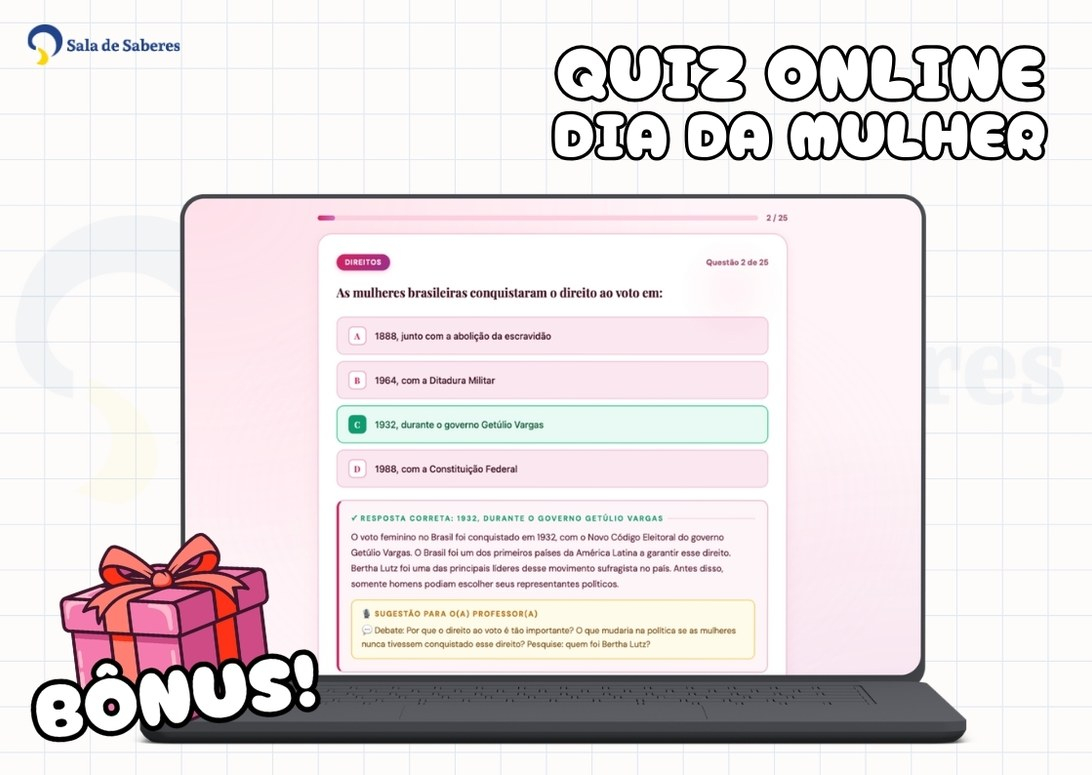 A proposta é que o quiz seja projetado no quadro ou tela da sala, possibilitando que as respostas sejam dadas de forma coletiva ou individual, conforme a preferência e a organização de cada professor. Uma forma leve, envolvente e eficaz de trabalhar o conteúdo com toda a turma.
