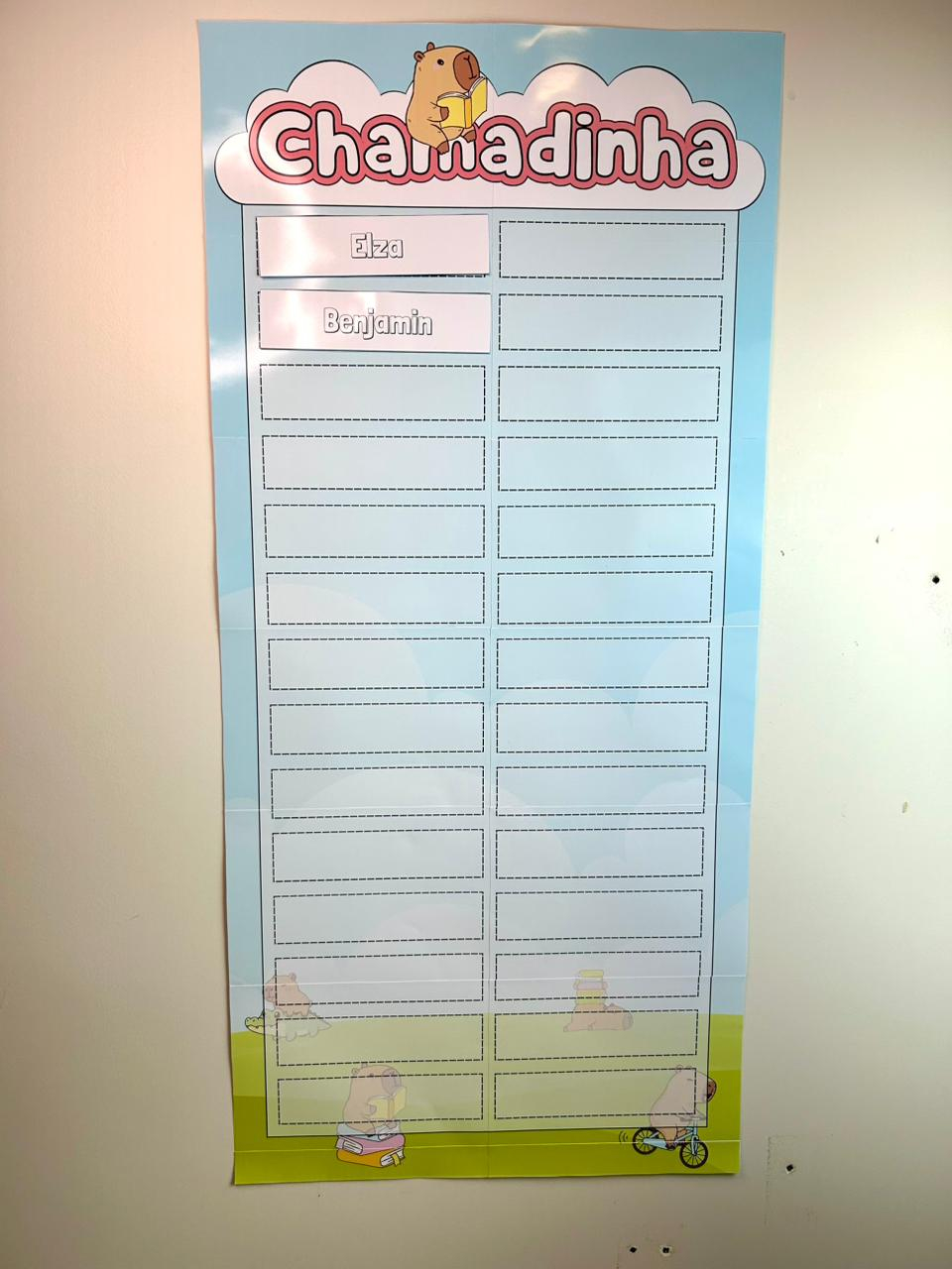 Painel de chamadinha com tema capivara, colorido e atrativo, ideal para organizar a rotina escolar. Indicado para Educação Infantil e Anos Iniciais, favorece a participação dos alunos, a noção de tempo e a construção de uma rotina significativa em sala de aula.