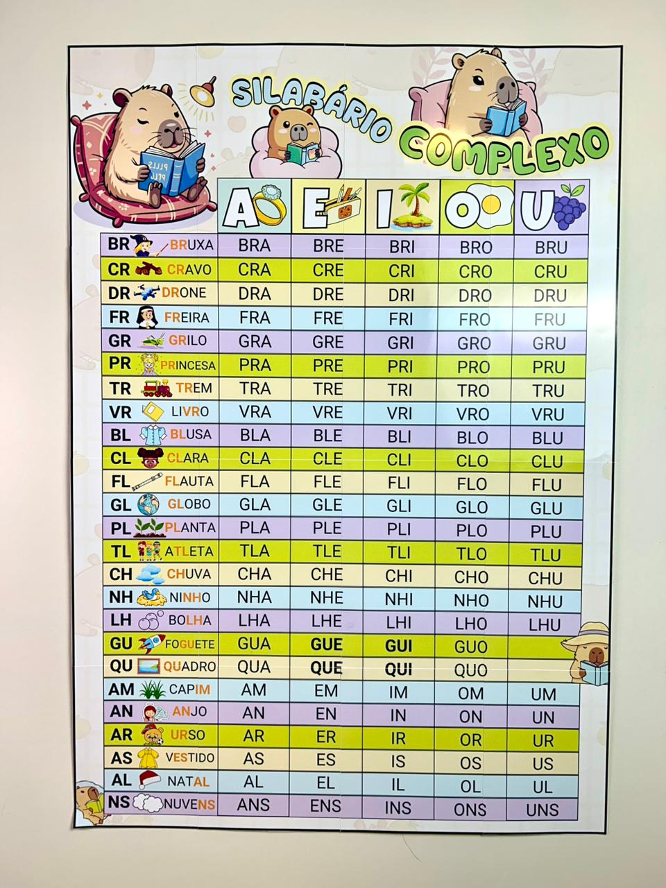 O material oferece recursos completos para o processo de alfabetização. O silabário simples cursivo e em letra bastão atende crianças em fase inicial de alfabetização, funcionando como apoio visual constante. Já o silabário complexo cursivo e em letra bastão desafia aqueles que já consolidaram as primeiras hipóteses de escrita e estão prontos para compreender padrões ortográficos mais elaborados.