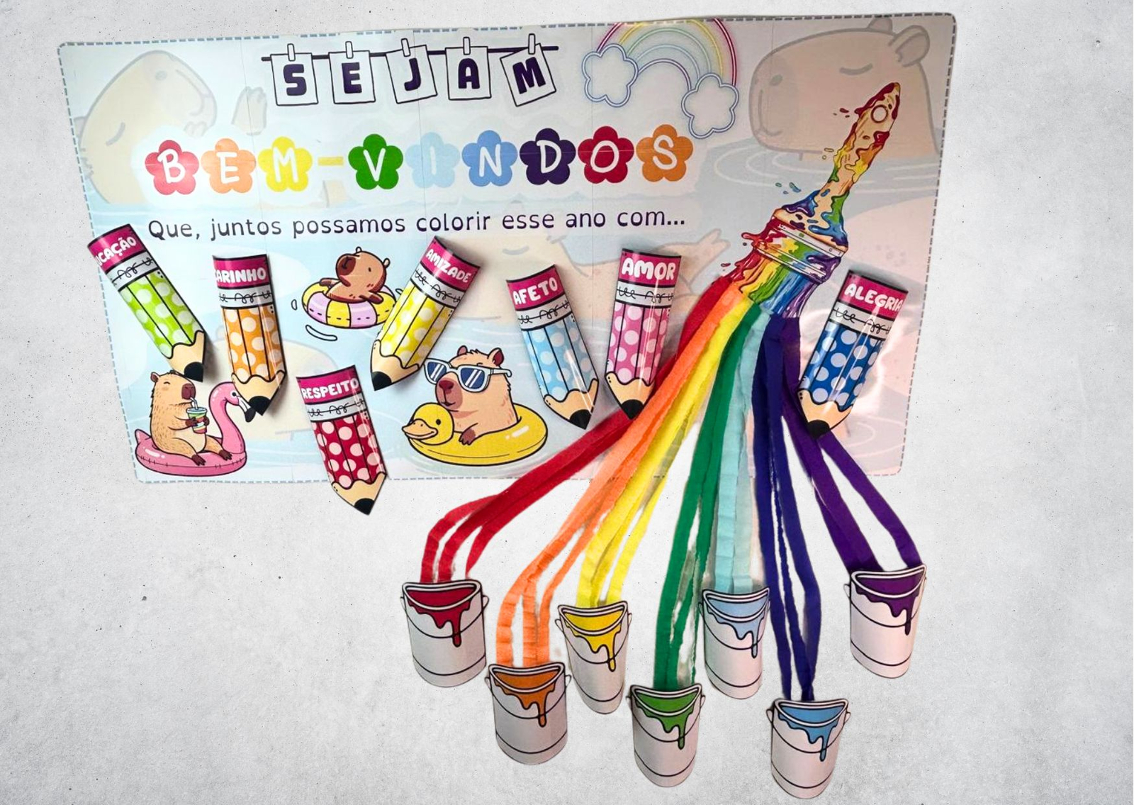 O painel geral bem-vindos interativo acolhe as crianças diariamente, reforçando que aquele é um espaço seguro e receptivo.