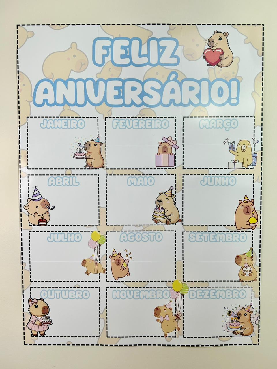 Painel de aniversário colorido com tema capivara, ideal para organizar e destacar os aniversariantes de cada mês, promovendo acolhimento, interação e valorização dos alunos no ambiente escolar.