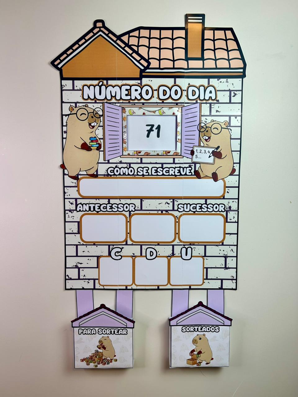 Material educativo colorido com tema capivara, ideal para trabalhar o Número do Dia de forma visual e organizada, auxiliando na aprendizagem dos números de 1 a 100 na Educação Infantil e nos Anos Iniciais.