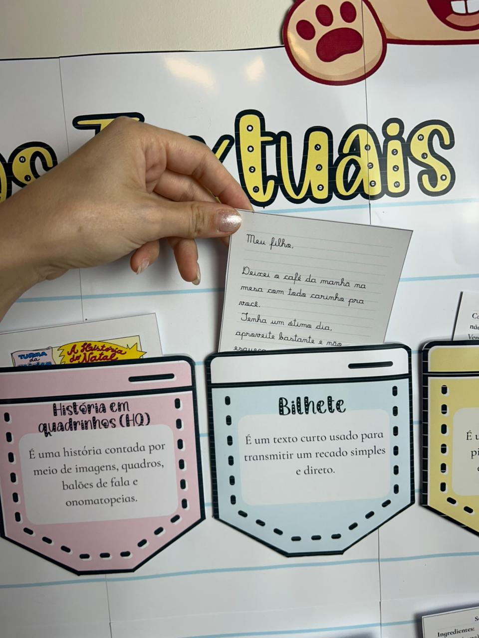 O painel possibilita o contato das crianças com diferentes gêneros textuais de forma concreta e visual. A organização em bolsinhos permite que os textos sejam manuseados, trocados e explorados com frequência, favorecendo a compreensão de que os textos circulam socialmente e possuem objetivos variados. Essa proposta contribui para ampliar o repertório de leitura e fortalecer as habilidades de escrita desde os anos iniciais.
