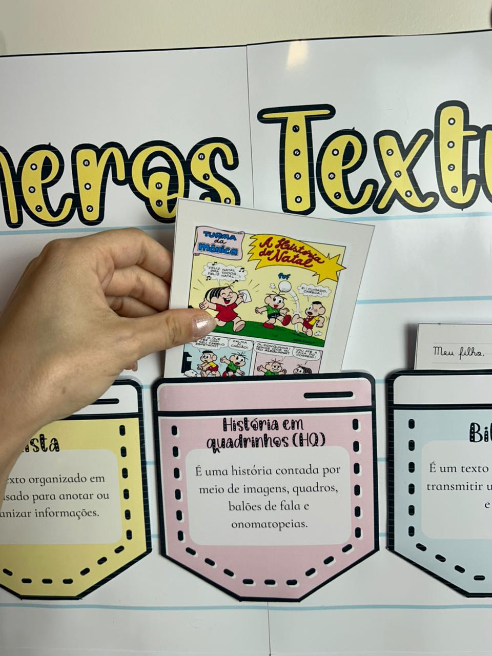 O painel pode ser utilizado como recurso permanente na sala, compondo um espaço de leitura e escrita acessível às crianças. O professor pode apresentar um gênero por vez, realizar leituras coletivas, discutir as características do texto e propor produções individuais ou em grupo. Os bolsinhos facilitam a organização e permitem que novos textos sejam inseridos ao longo do ano letivo.