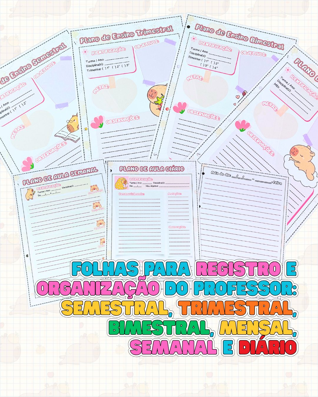 O tema capivara traz leveza, simpatia e conexão emocional com o cotidiano escolar, tornando o planejamento mais prazeroso. O planner conta com seis opções diferentes de capa, permitindo que cada professor escolha a que mais combina com seu estilo. Além disso, acompanha uma folha exclusiva com diversas ilustrações de capivaras prontas para impressão em papel adesivo, ideais para recortar, colar, decorar páginas, cadernos, avaliações ou materiais pedagógicos.