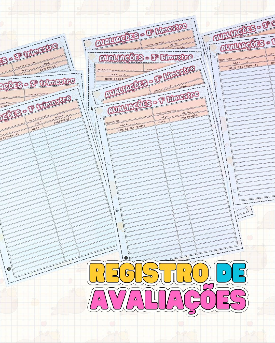 O planner contempla páginas para chamada, registro de atividades de casa e temas, acompanhamento das devolutivas das tarefas, além de tabelas para registro de avaliações e notas organizadas por bimestres, trimestres e semestres. Também há espaço para registrar encaminhamentos ao Atendimento Educacional Especializado, fortalecendo a prática inclusiva.
